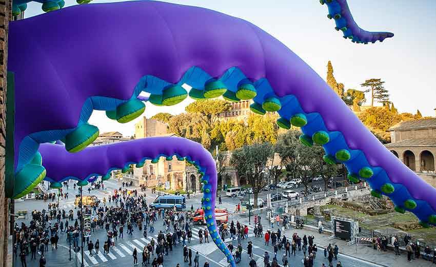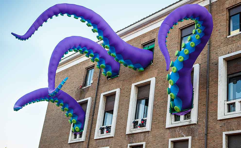 Watch as our octo tentacles burst from windows, googly eyes appear in trees and giant creatures climb from the rooftops!