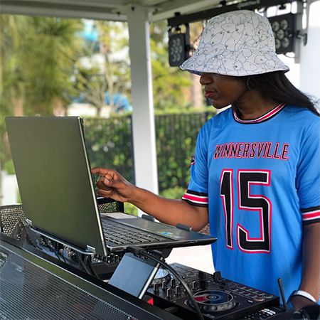 Experienced female DJ and dancer with 20+ years in entertainment, adding energy through interactive DJing, live MCing, and motivational dance moves