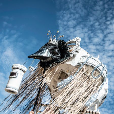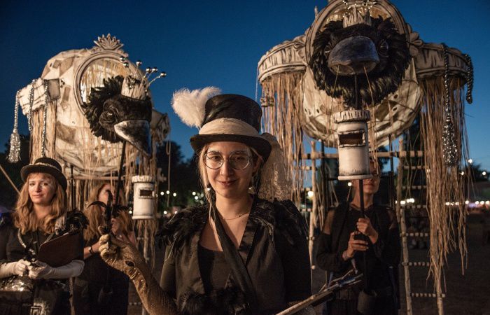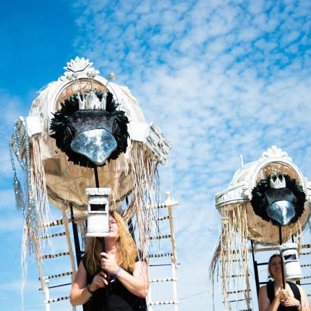 Our mystical walkabout act consists of two puppeteers leading the magpies and two helpers engaging with the audience to write messages for the birds