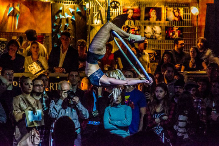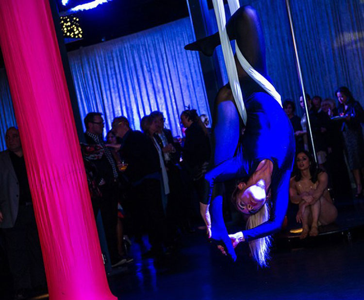 - Performer pouring champagne aerial hammock Casino Montreal Re-opening event
