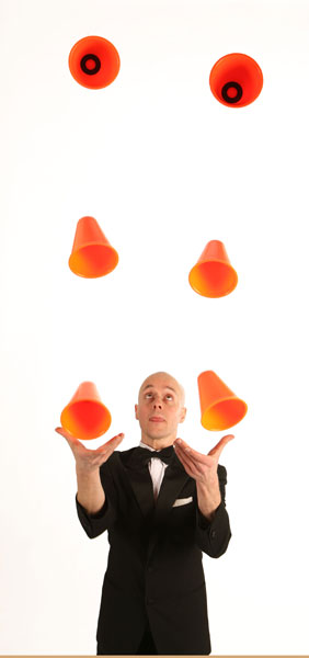 Performed in classic gentleman juggler attire with dinner suit, bow tie and a smart pair of shoes, this circus performer and circus juggler is sure to impress guests. His show is perfect for all kinds of events and ages and can be easily adapted to suit any situation.