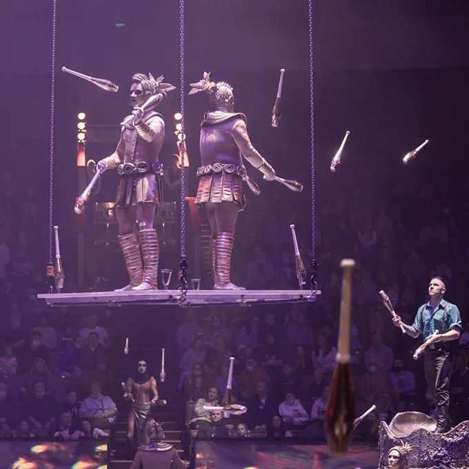 In addition to impressive juggler tricks they use aerial techniques to raise themselves high above the stage while maintaining their juggling rhythm