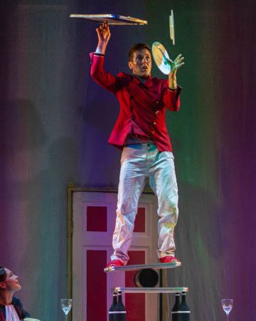 His juggling skills include balls, clubs, rings, hats, and contact juggling and his chic gentleman-style routine with bottles is always a big hit