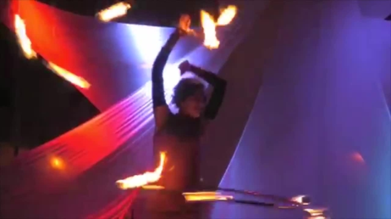 Features novel fire props such as hula-hoops and fire sticks