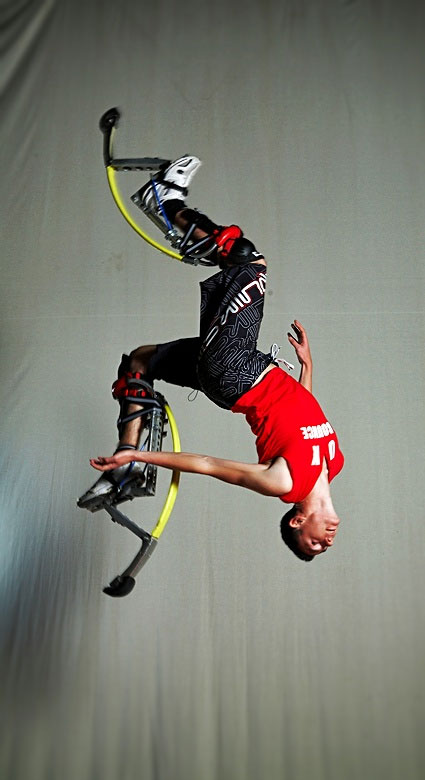 The International Jumping Stilts Acrobat is a truly original, professional performer with over five years of worldwide experience. His artistry involves the use of spring loaded stilts, displaying multiple tricks and somersaults. His breathtaking performances can also include Angle Grinding and Fire skills, breathing fire, using Poi while Spinning and throwing staff tens of feet into the air.