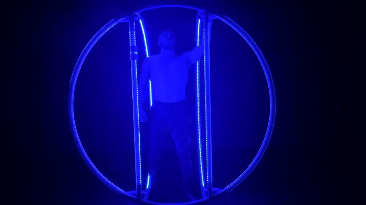 Elite cirque performer showcases unmatched balance and control on his unique LED Acrobatic Handstand Wheel, blending precision with artistry