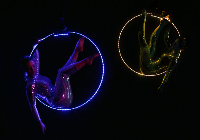 Both professionally trained acrobats, our aerial hoop artists have devised this act with high-end events in mind. Lighting up any venue with their sparkling illuminated costumes, the LED circus performers will have your guests mesmerised as they perform spectacular aerial gymnastics. A completely customisable glow act, the colour of our performers costumes and the colour of the LEDs can be set to accommodate your event’s colour scheme or theme. Also ideal for promotional events, our aerial performers’ costumes can be branded with your company logo to advertise a new product or campaign.