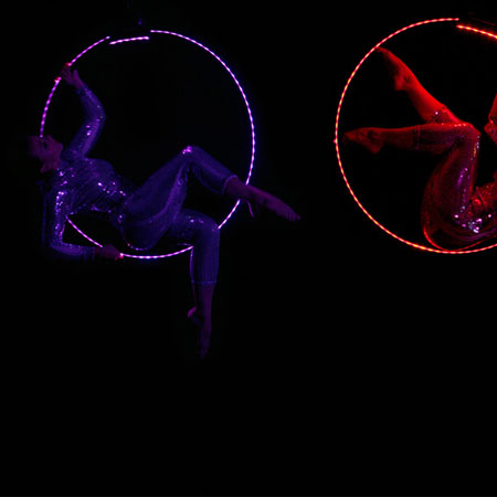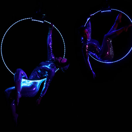 Scarlett Entertainment UK is the go-to booking agency for numerous high profile corporate companies and private clients all over the world. Able to work on a personal basis with individual clients, we will provide a tailored service, ensuring that you receive the perfect entertainment for your event. Our fabulous LED Aerial Hoop Duo is an eye catching show from a an aerial hoop artist duo. The brightly lit aerial performers create elegant shapes, balances and acrobatic moves whilst suspended in the air from an aerial rig. If you are looking for a wow factor glow act that will bring a touch of sophistication to your special occasion, our LED circus performers are the ultimate choice.