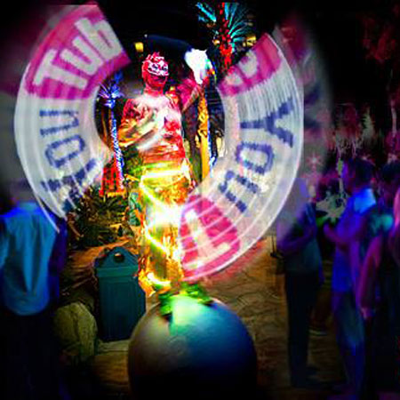 A creative marketing tool, our innovative Las Vegas based LED artist effortlessly juggles the glowing poi while balancing on top of a giant rubber ball. Able to turn any company logo into an illuminated holographic image, our adept ball walker is certain to leave your branding burned in guests minds!
