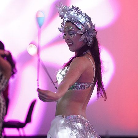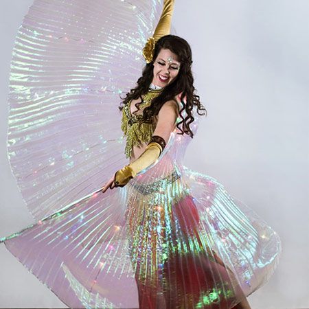 Available with a range of colourful LED props, including glowing fans, Isis wings and poi, she can adapt to many event settings and venue sizes