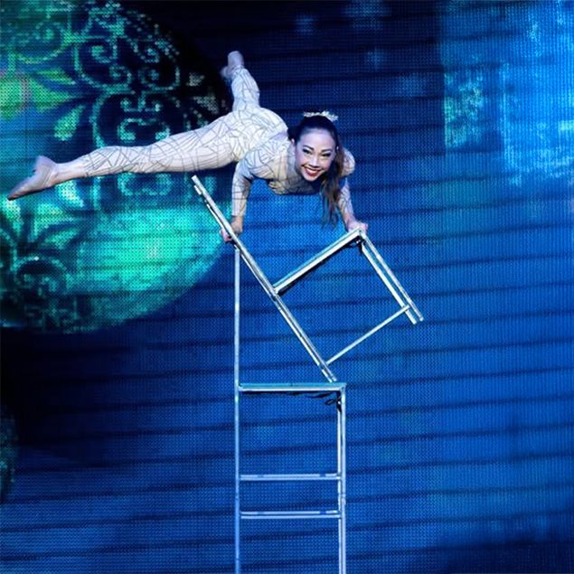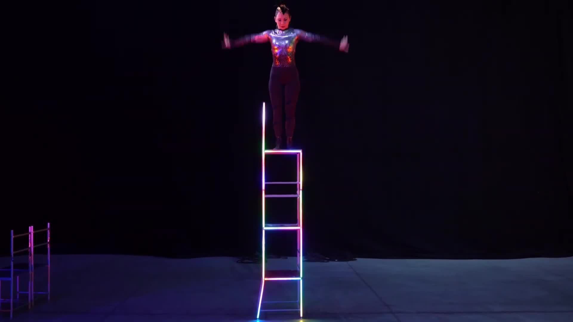 Pushing chair balancing to new heights, she adds dazzling LED effects, transforming a classic act into a modern spectacle of light and acrobatics
