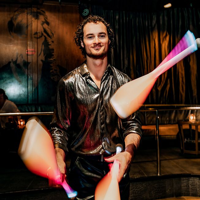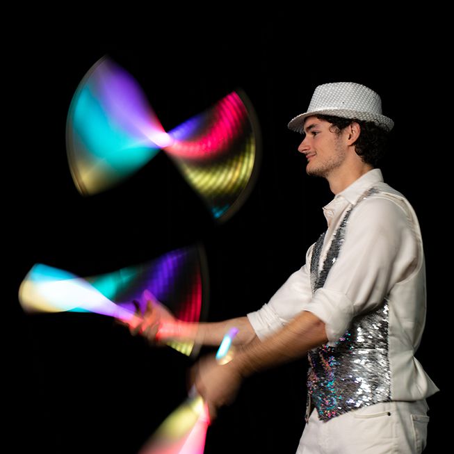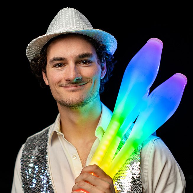 As an LED club juggler, he has performed with top companies, entertaining large audiences on national theatre and arena tours
