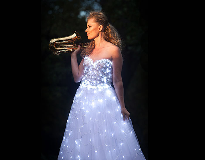 The LED dress can be worn by a variety of carefully hand-picked female musicians with two violinists and two saxophonists available. Regardless of who is playing the instrument, all eyes will be on the dress.