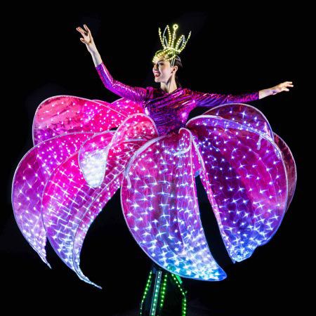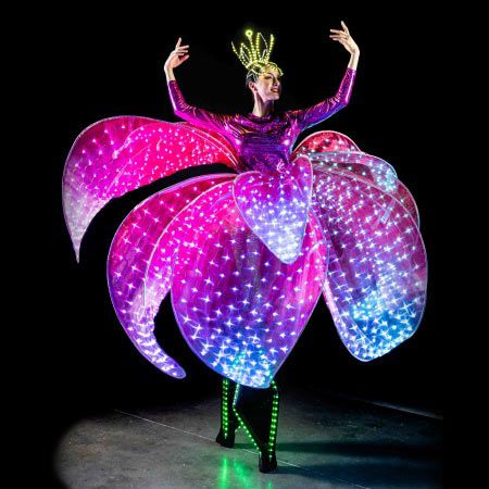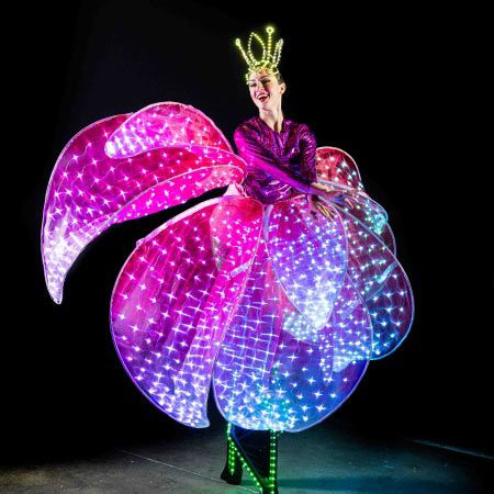 Our stunning themed stilt walker will dazzle partygoers of all ages with her extraordinary and extravagant, multicoloured floral LED costume
