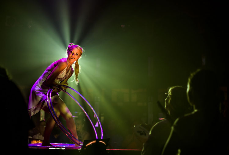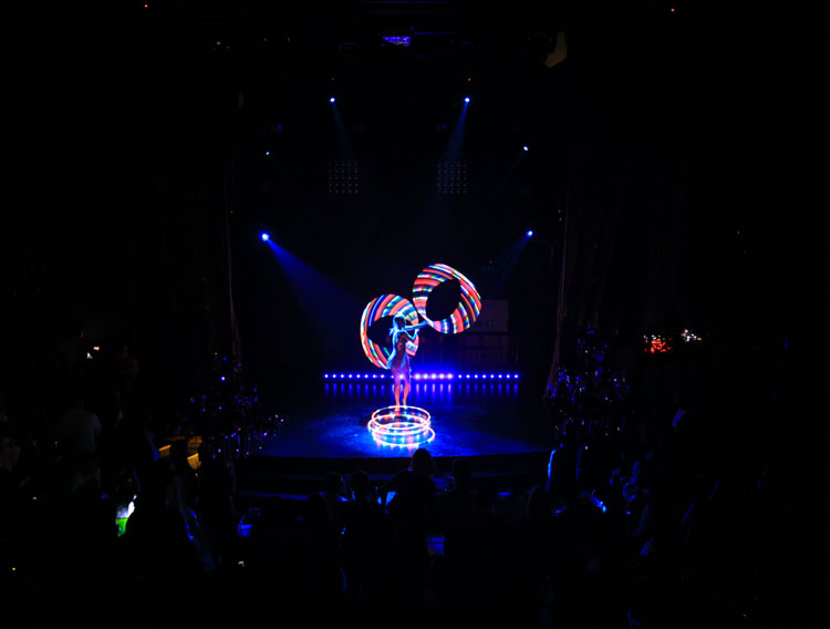 Having trained with the elite Beijing Acrobatic School, our LED hula hoop dancer combines her unique skills for hula hooping multiple hoops whilst she brightens the stage with her mesmerising LED hoops. With over 10 years of experience performing her incredible hula hoop routine this acrobat has astounded audiences in over 42 different countries! Mixing highly skilled routines with flexibility, strength and vibrant LED lights this hula hoop performer will light up every event.