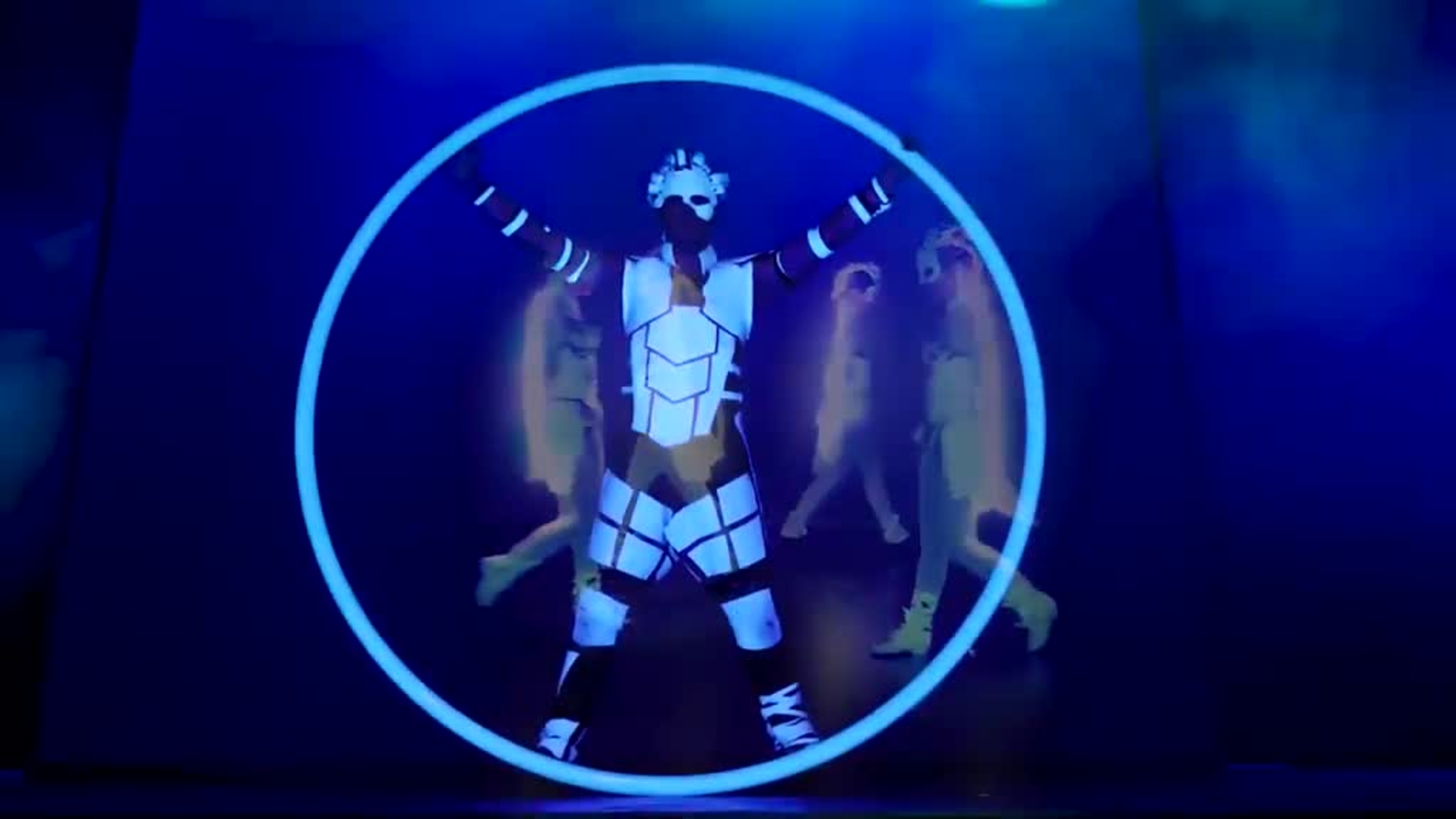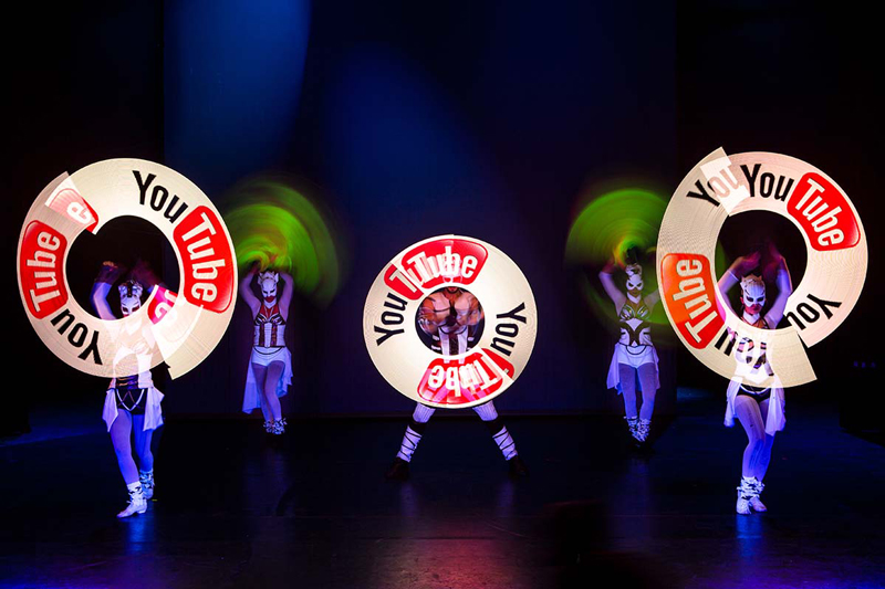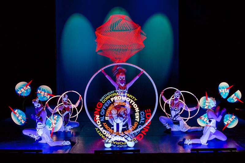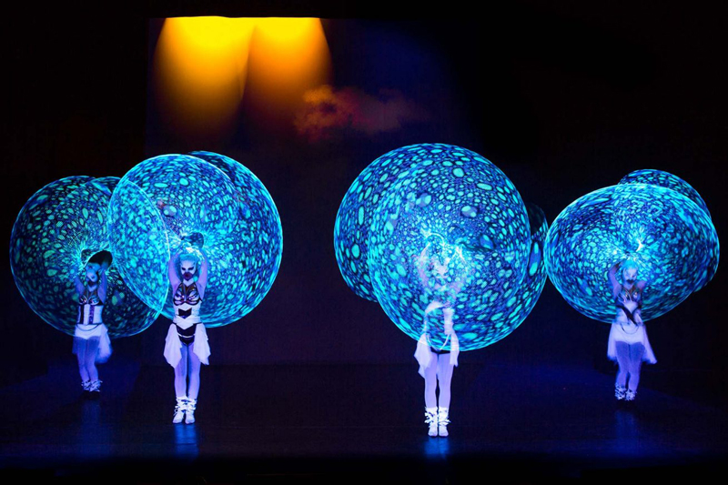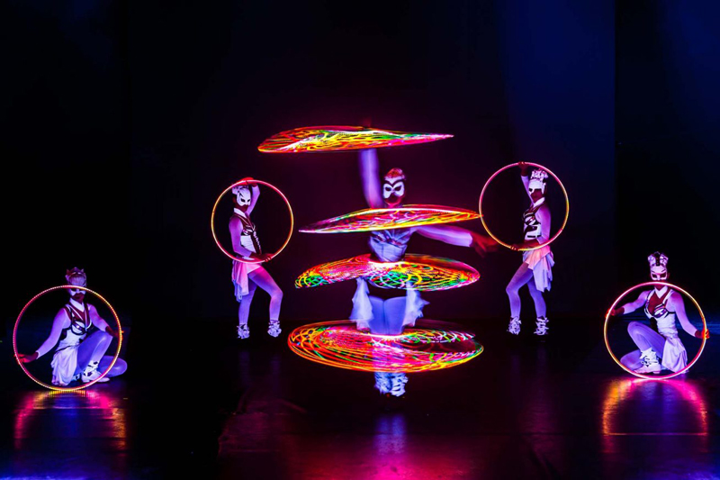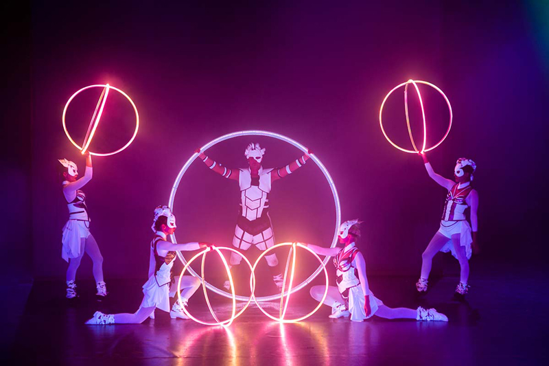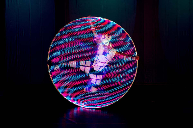 This fascinating fusion of LED pixel Cyr wheels, hula hoops, light juggling cubes, LED bugeng and LED poi is especially suitable for dark environments or spaces with dim light conditions. Boasting perfectly synchronised choreographies and impressive acrobatic moves, these LED and glow performers make this show a truly unique experience.