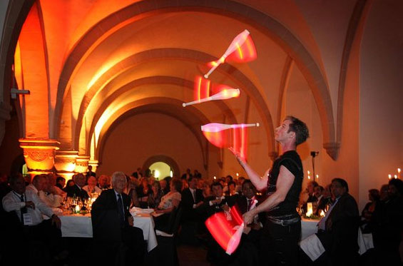 In this incredible juggling light show luminous clubs, sticks and balls create a kaleidoscope of colours creating beautiful patterns and evocative images as they soar through the air leaving a brilliant trail of light in their wake. The clubs, sticks and balls can be programmed to show any colour and to pulsate in time with the music and choreography, creating a sensational all round performance that will WOW audiences. Audiences will watch in wonder as these beautiful objects appear light shooting stars against the black drop of the stage, creating an opulent and magical atmosphere that will enchant and delight.