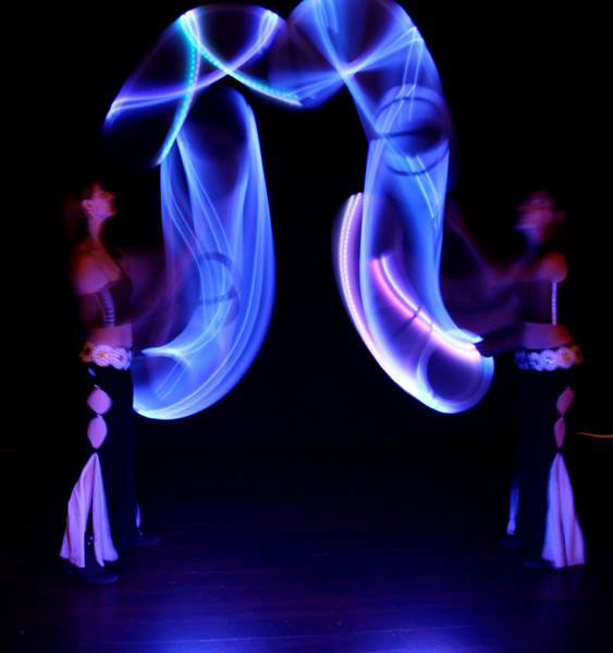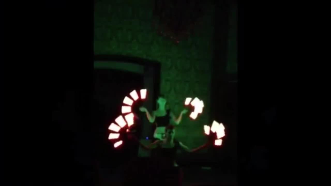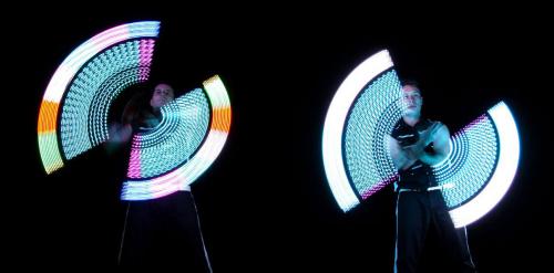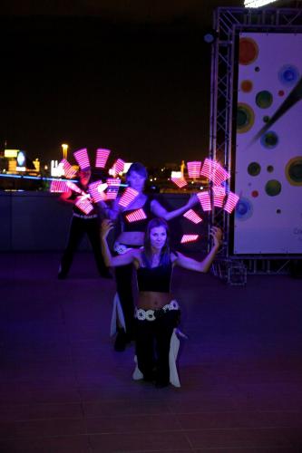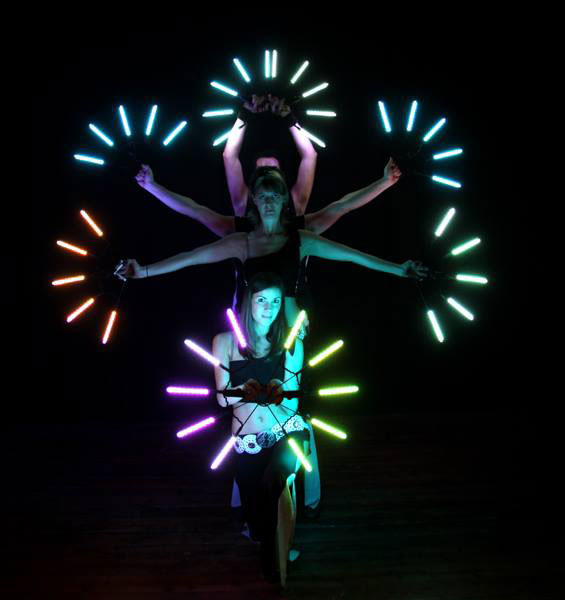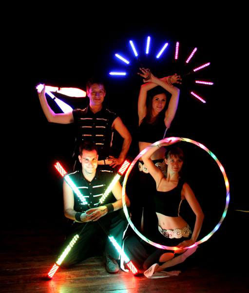 Their shows are mesmerising kaleidoscopes of brilliant colours and lights using a range of tools such as clubs, sticks and pois. Each of their LED juggling tools are fully programmable and can display an almost endless variety of images and colours during any given performance, in sync with the music and the choreography. They can also be used to display companies’ logos, branding colours, text and more.