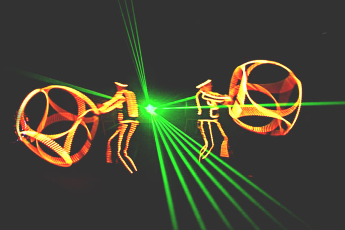 With our LED and Laser groupo, glow is most definitely their passion! From walkabout glow jugglers or LED hula hoop artists, to our full laser shows - involving custom made hoop-cubes, LED costumes and light poi projecting your logo into thin air - this LED act have got it all.