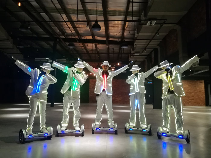 The LED dance show is perfect on a stage with the lights off giving it its maximum impact. The LED dancers create amazing dance choreographies that include all the classic moves like the moonwalk. Alternatively, the LED Michael Jackson Dancers can perform a hoverboard show with less energetic dance moves but more of a roaming ability.