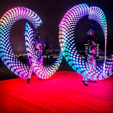 Performing to electronic music these Sweden Mirror Men move with precision and are synced with shifting images that are projected with the LED staffs. The ultimate roaming characters for any event looking for next level walkabout entertainment, our mirror performers astound and amaze at all events.