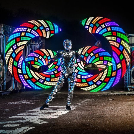 Watch as our LED Mirror Men refract light from every angle as they spin and twirl LED poi around their mirrored bodies. Also available as a fire performance option our Sweden Mirror Men take walkabout entertainment to exciting new levels and boast the ultimate mirror performers for any event looking to stun their guests.