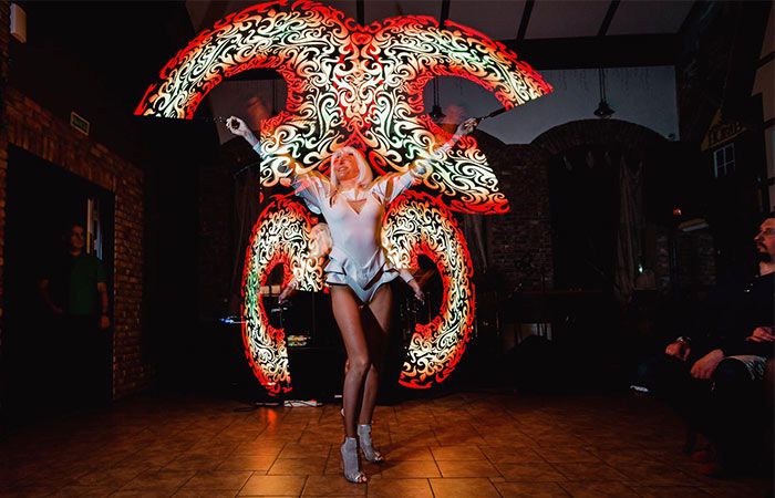 In addition, if you’re looking to provide your event with a modern and futuristic touch, this LED poi show can be the ideal entertainment option for you. These versatile female dancers can wear the costume that best adjusts to your preferences. As you can see in the pictures above, they offer magnificent futuristic outfits for different occasions. Their white dresses and their black and golden costume can be the ideal choice for any private and luxurious party.