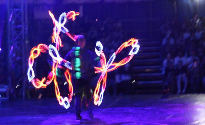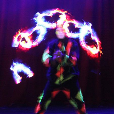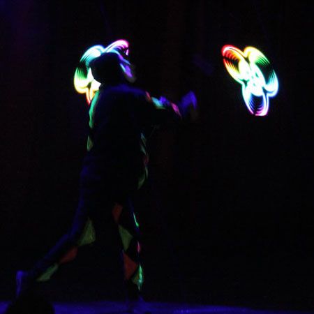 Mixing modern LED technology with classic circus arts, this LED poi performer creates a vivid, high-impact show with multicoloured spinning visuals