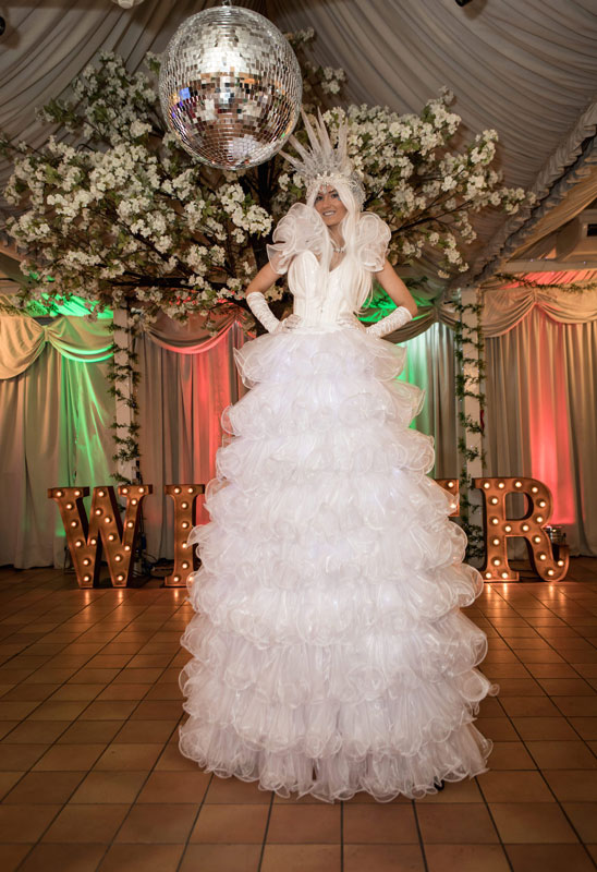 Dressed in long white gowns, their avant-garde costumes sparkle with LED lights, sequins, glitter, tulle, and white faux fur. Complete with theatrical makeup and ice crowns, our beautiful and ethereal roaming characters create a head-turning spectacle in any event setting.