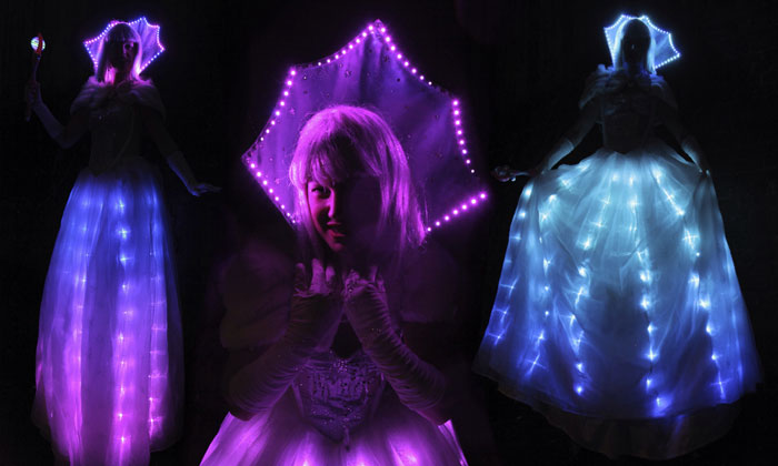 Book this stunning and unique LED stilt fairy to bring a magical new attraction to your event. This stunning LED stilt walker is sure to make a huge impression at any event with her beautiful costumes and radiant LED light display. Guests of all ages will be amazed by the colours and fabulous costumes of our stilt act as she walks through your event, interacting with the crowd and turning any event into a sensational winter wonderland. This LED act is perfect for winter events and Christmas parties as well as being a guaranteed hit at all kinds of Children’s events and fantasy themed festivals and parades. Book our fantastic walkabout act and amaze your guests with a magical visit from our snow fairy!