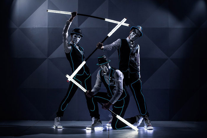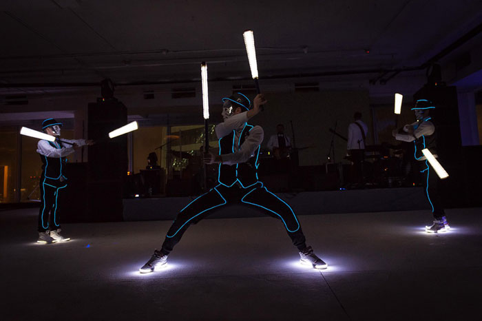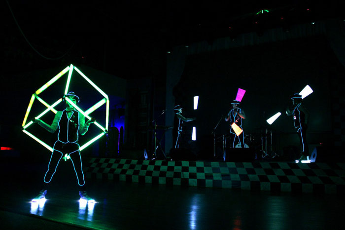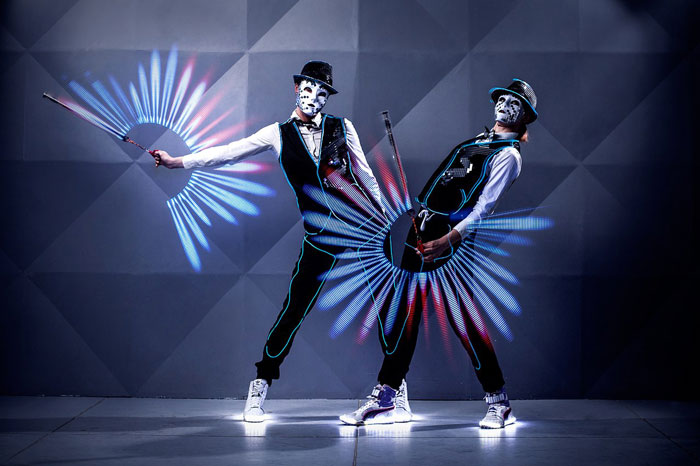 This is exceptional LED entertainment for corporate events, product launches, gala dinners, awards ceremonies and much more. The LED Suit Performers are not quite black tie, but they have very stylish illuminated costumes with waistcoats and hats. They can deliver a range of short ambient for energetic shows that are guaranteed to wow your guests.