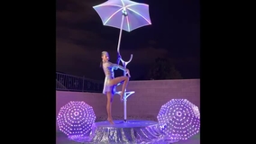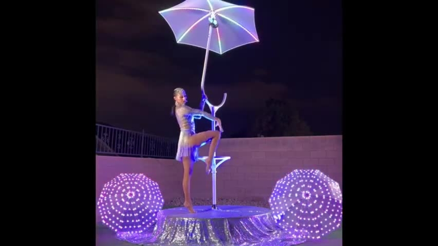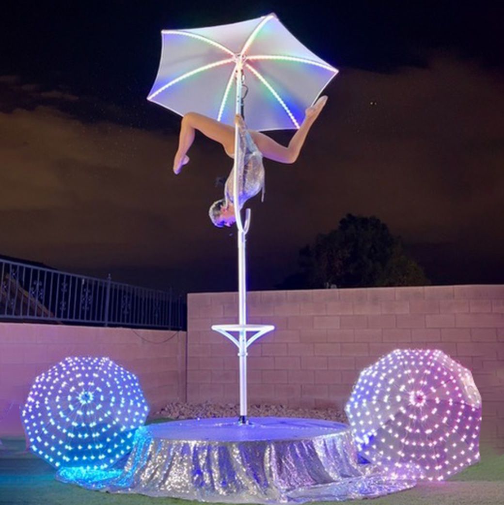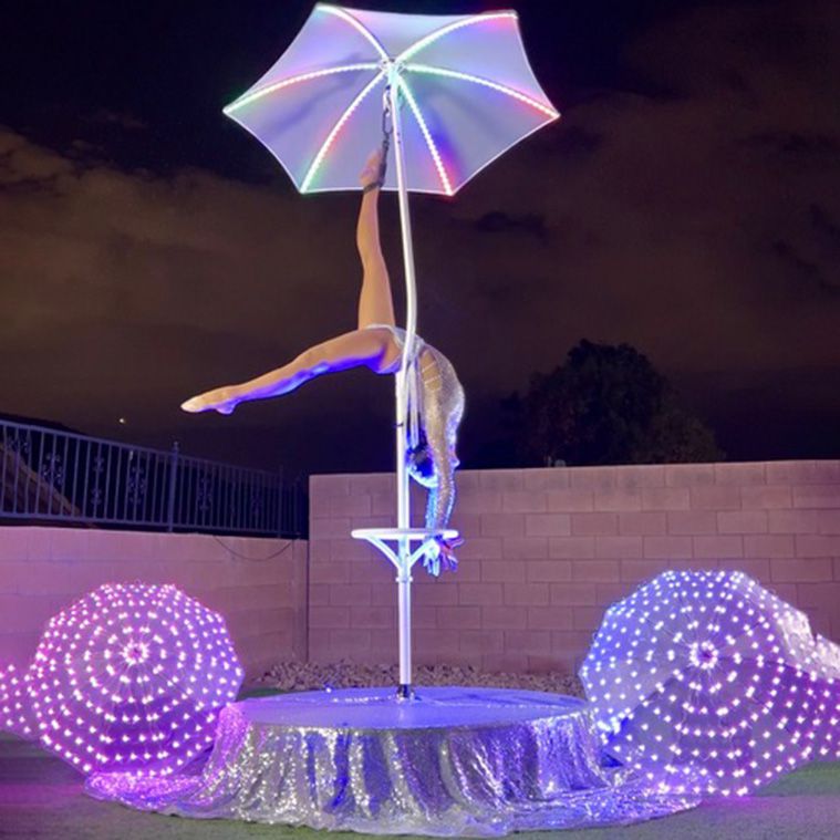 Captivate your guests with the elegance of an aerial artist as she performs stunning routines on her freestanding LED umbrella