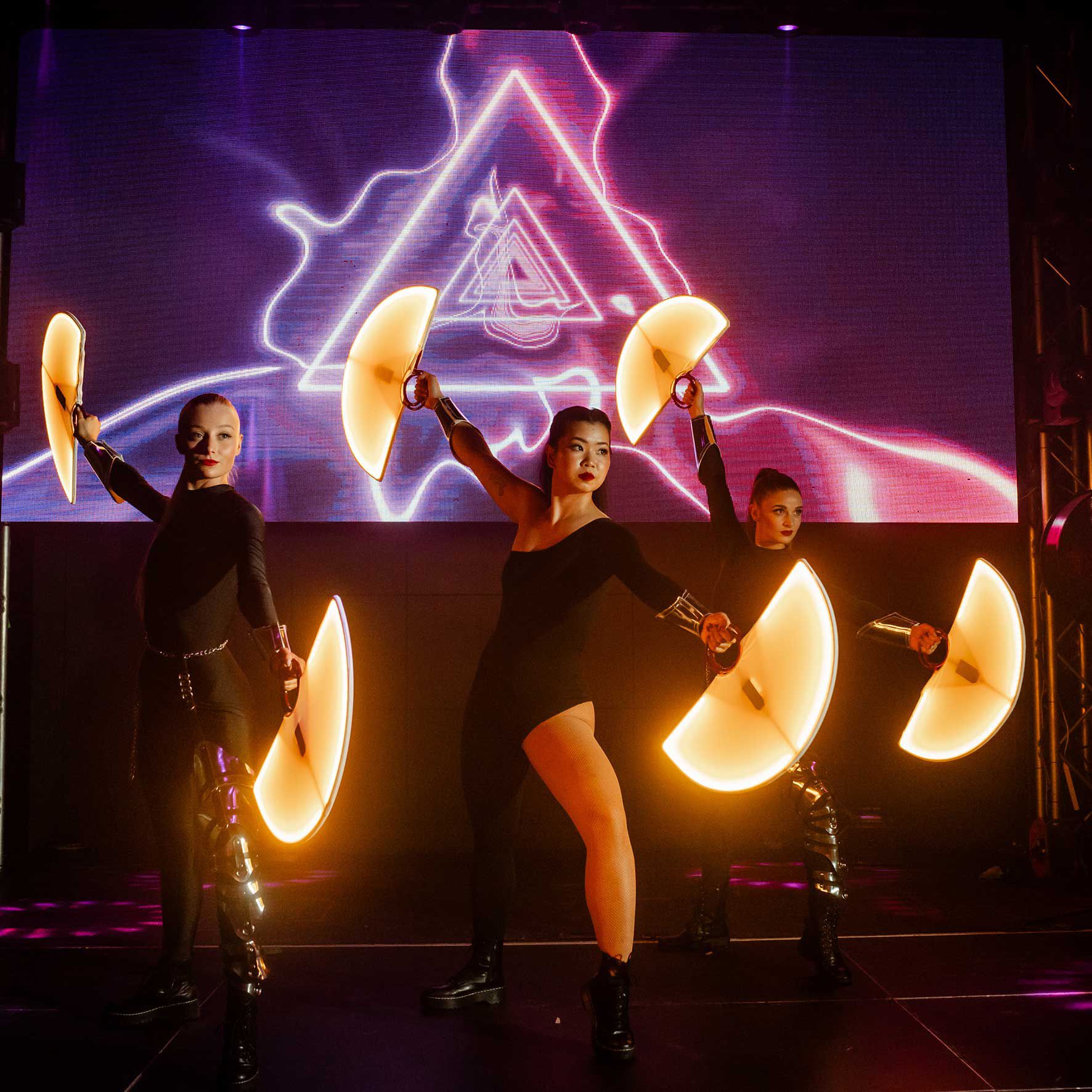 A visually captivating dance performance featuring choreographed routines with glowing LED fan props to create an unforgettable stage performance