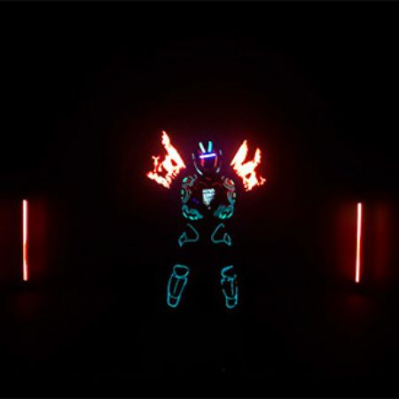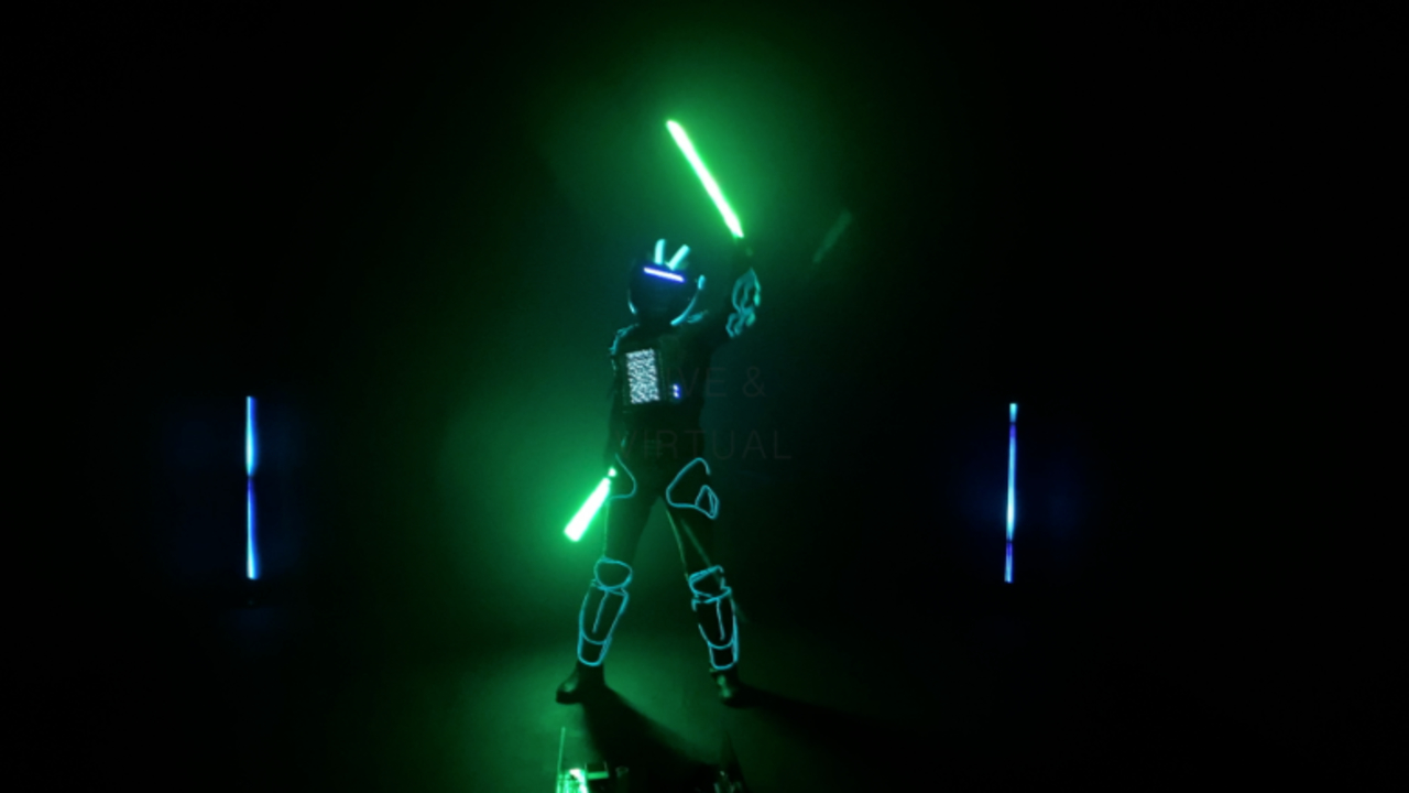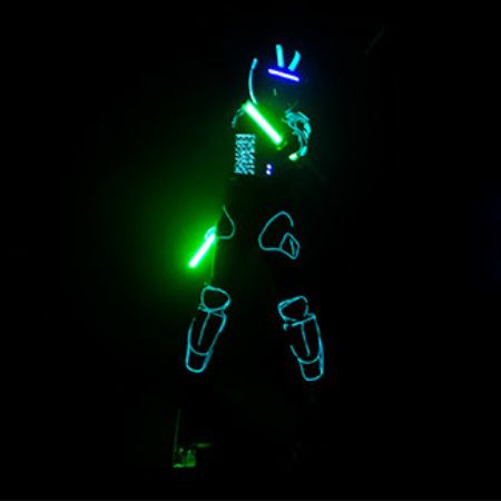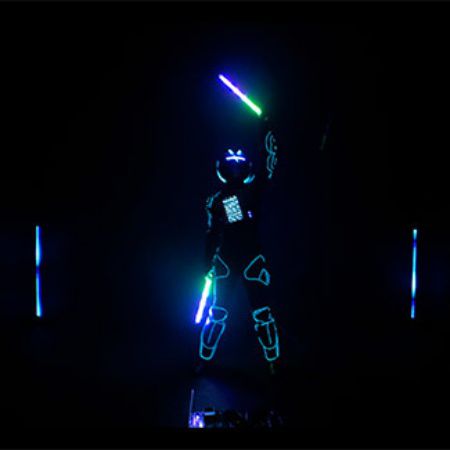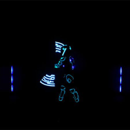 A high-energy light show featuring an LED Tron costume, laser effects and spinning LED poi performed to fast-paced music for maximum impact