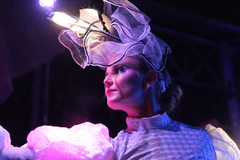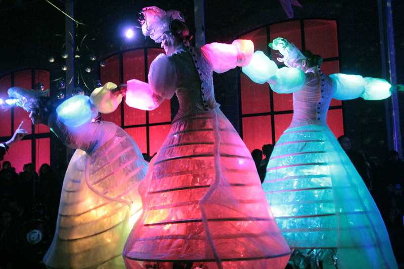 Utterly unique and futuristically advanced these costumes have been recently developed with help from The Circus Space and Aerotech to now have a LED colour lighting system. They can change to any colour in time to music or whim with their advanced computer systems.