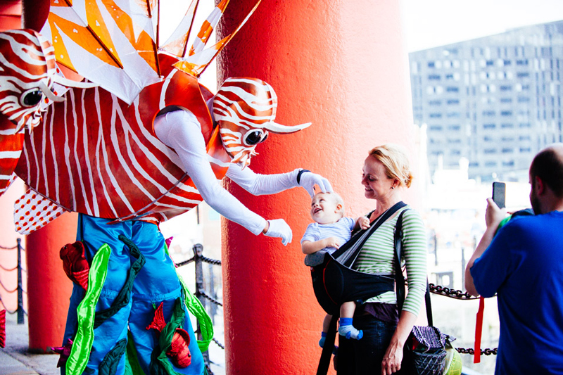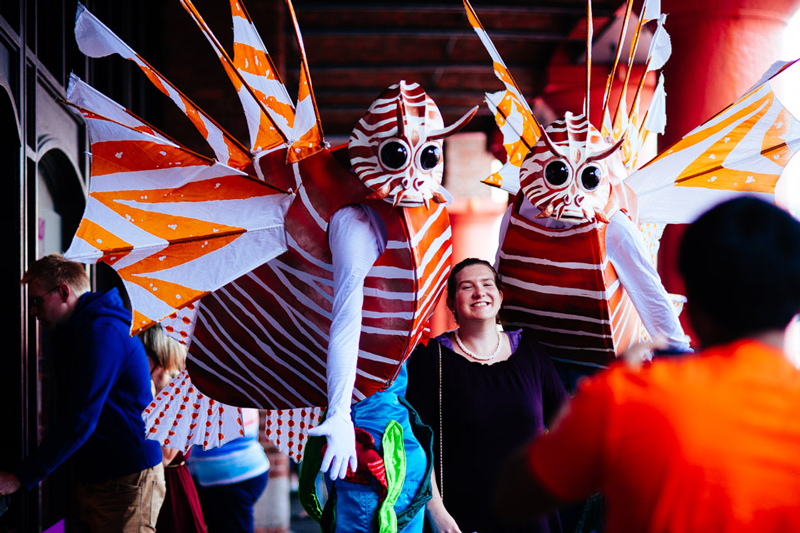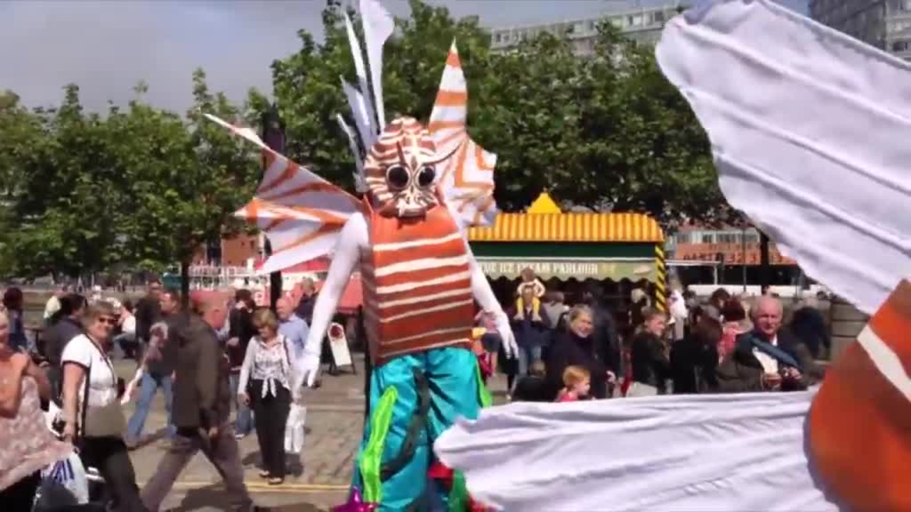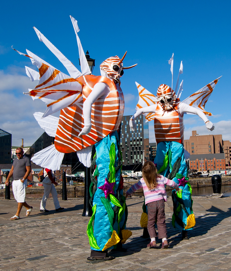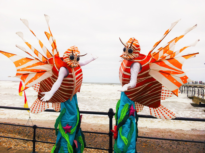Watch in awe as these two brightly-coloured sea creatures on stilts wander through the crowds, like fish out of water