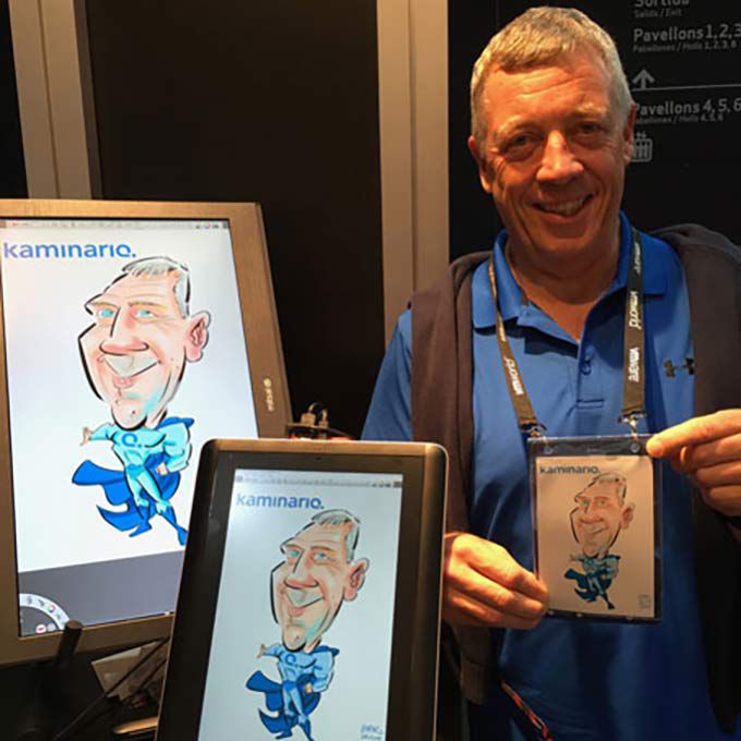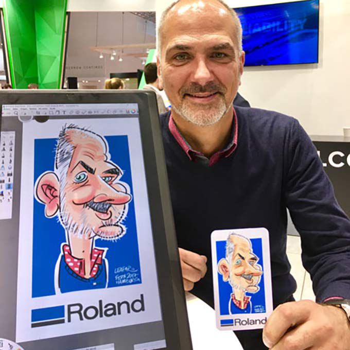 Using a digital tablet to create speedy portraits of guests, he can customise the images with your logo, a special message or a themed template