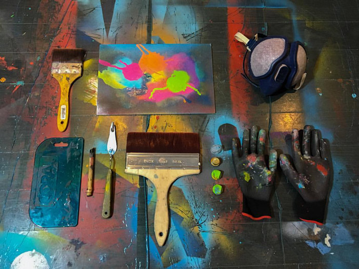 The abstract artist is able to work with a variety of mixed media. Using primarily spray paint, which are suitable for indoor use, the London-based live event artist energetically constructs fascinating works of art. The live painter can include logos or branding, which may be revealed once the painting is completed, and even use UV lighting to make certain colours and shapes stand out even more.