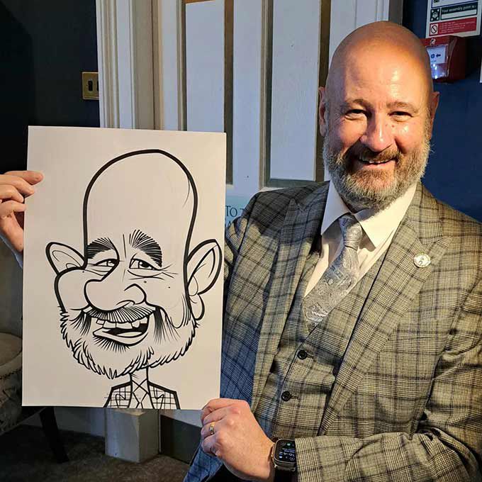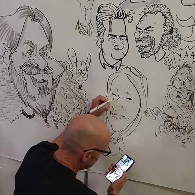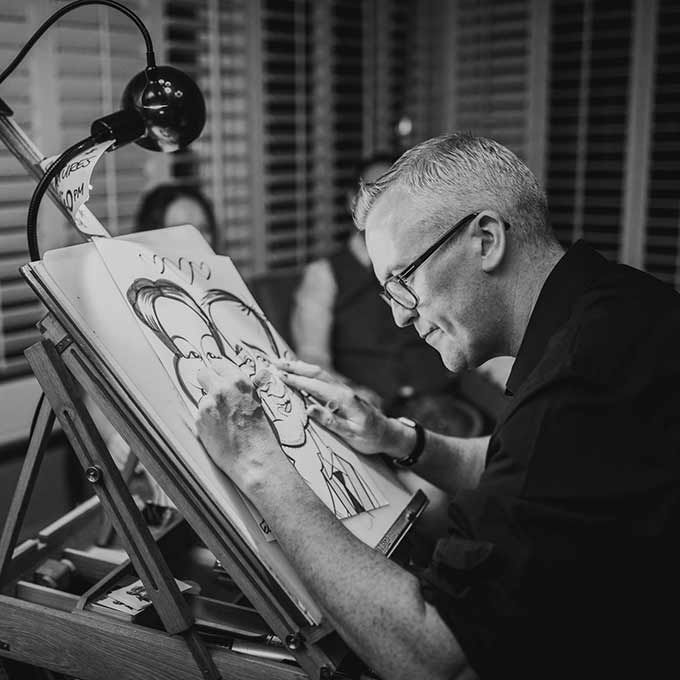 Specialising live caricatures of guests, he creates caricature portraits, humorous illustrations and artworks for guests to take away from the event