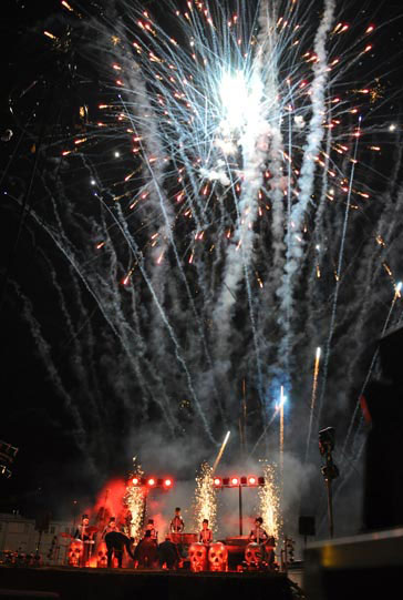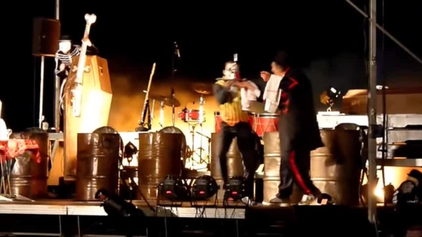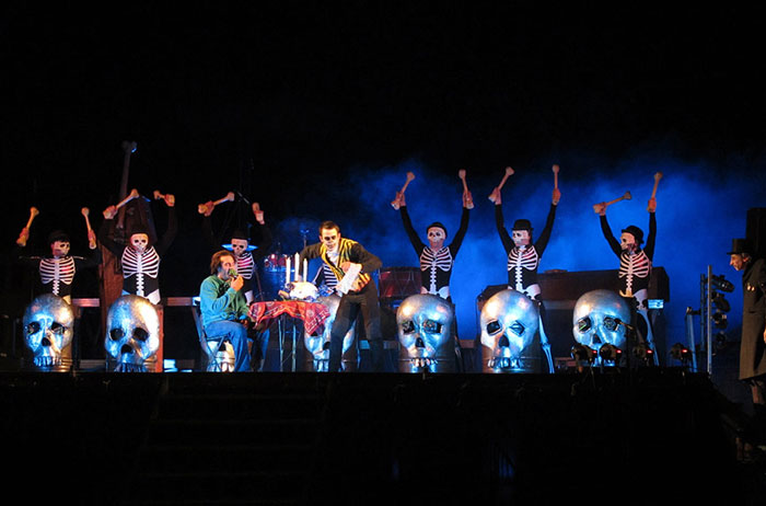 The second half is theatrical music show that takes place on a stage. The drummers appear, now dressed in skeleton costumes, a perform on large metal barrels and a member of the audience is brought up to be part of the show. Other parts of the Living Dead Drumming Show include acrobats on a Chinese pole and a live music spectacular finale with loads of pyrotechnics.