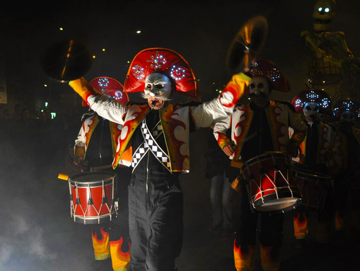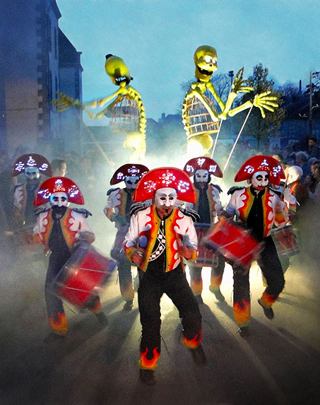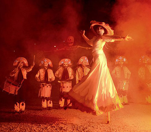 This exhilarating Living Dead Drumming Show begins on the outskirts of the performance area as a troupe of Day Of The Dead-esque drummers parade their way through the crowds. The pulsating rhythms of the drumming parade is accompanied by two giant roaming skeletons, a stilt walking dame and several fire performers. The vibrant and lively drumming parade is raucous affair that engages with the audience and excites everyone.