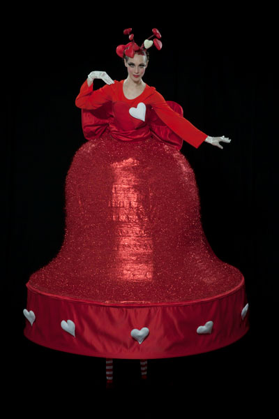 Our love bell stilt walker will need a ceiling height of 3m in order to walk about freely at your event. They can also perform alongside our Stilt Queen of Hearts, acting as her royal court. Contact our entertainment specialists today to find out more.