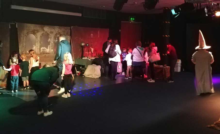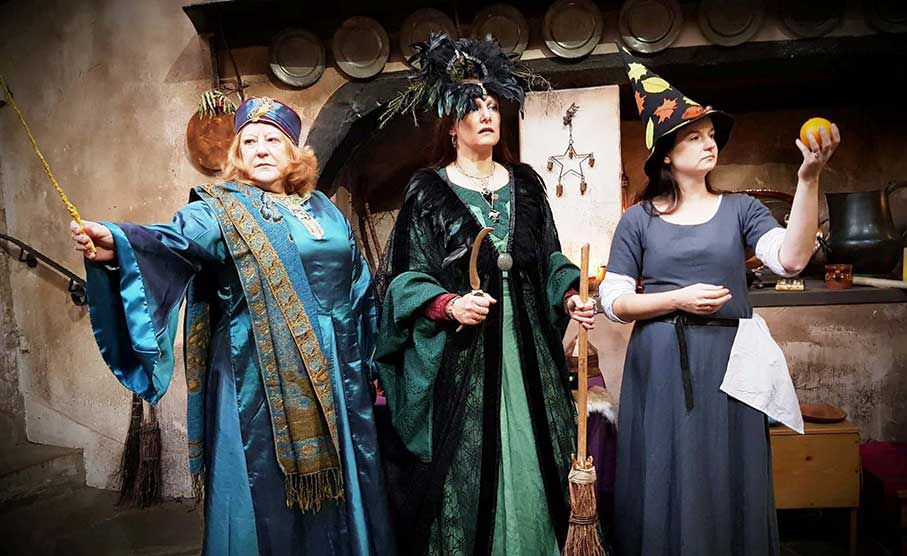 The laboratory or coven space includes wizards' equipment, books and backdrops and even a dragon and runs with two witches and two wizards