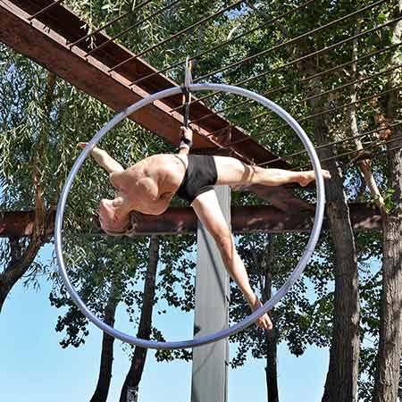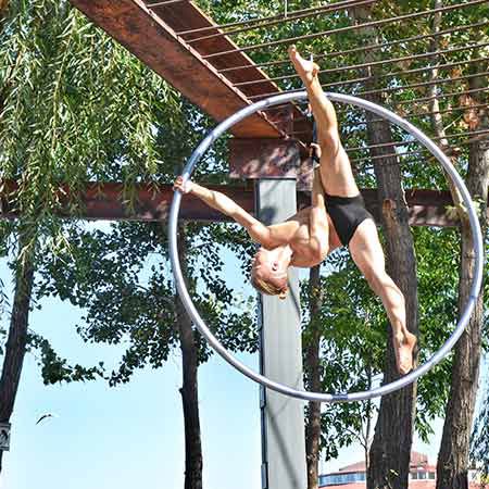 Already a high-impact show, our fantastic cirque artists can also perform his show as an aerial Cyr wheel, combining ground and aerial acrobatics