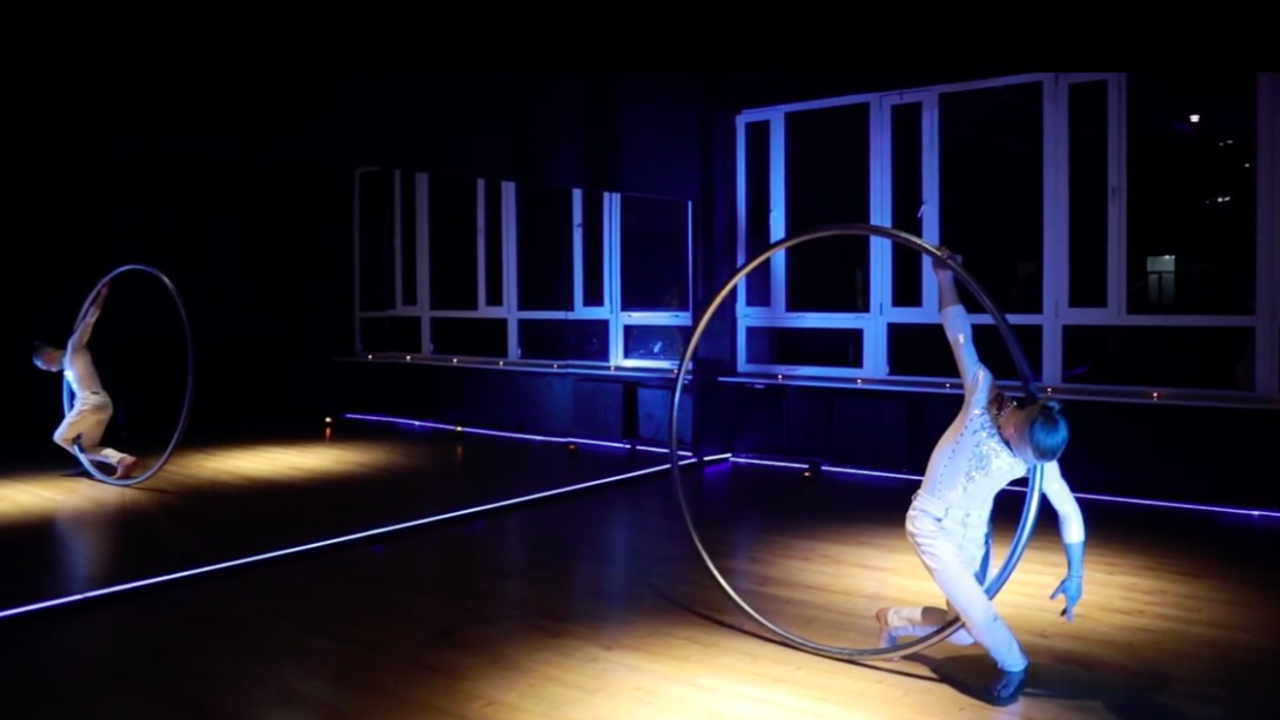 In an incredible display of strength and dexterity, this German Wheel artist spins and rolls in a Cyr Wheel apparatus all over the stage
