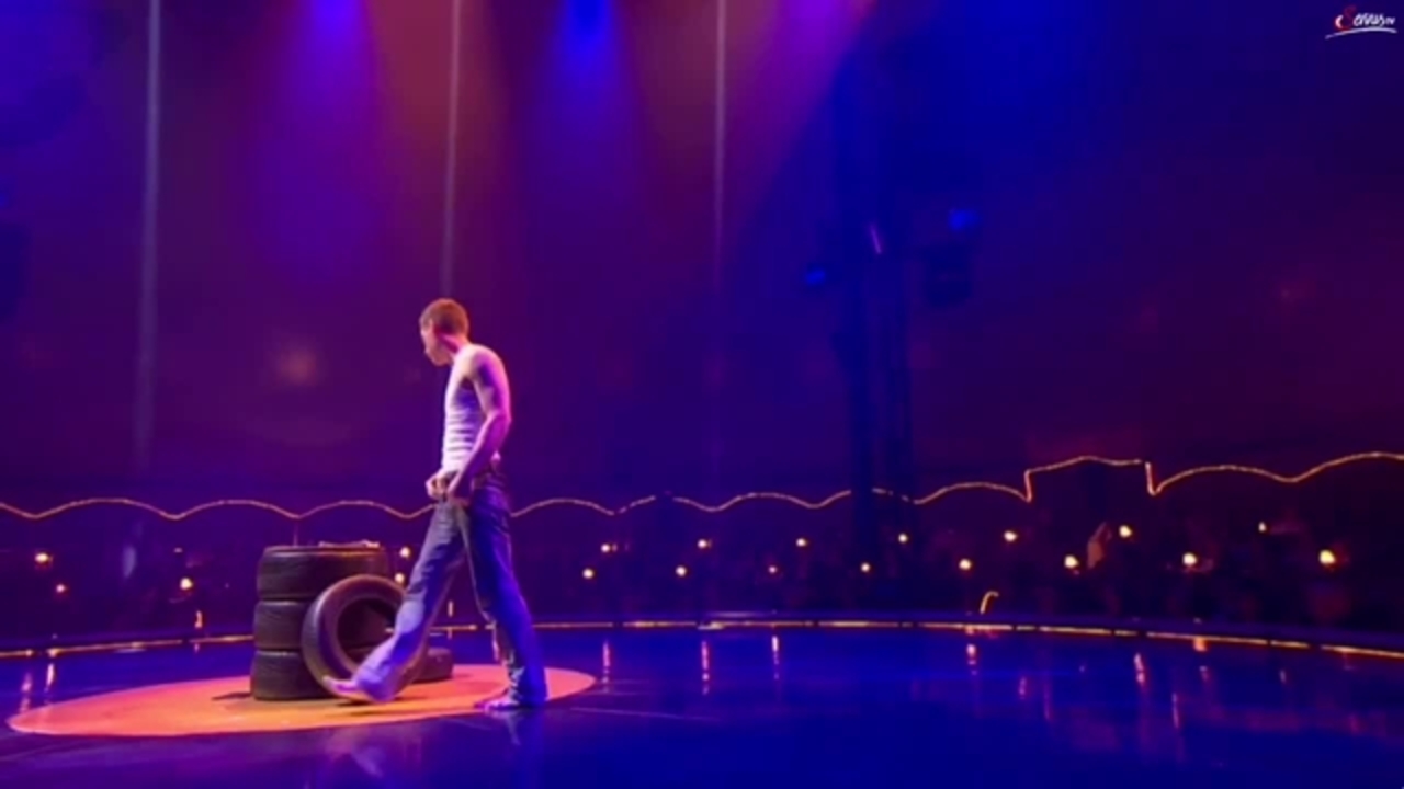 With insane muscle power, our male acrobat performs an enthralling routine of handstands, one arm balances, hand to hand balance movements and acrobatics atop a tower of tyres.