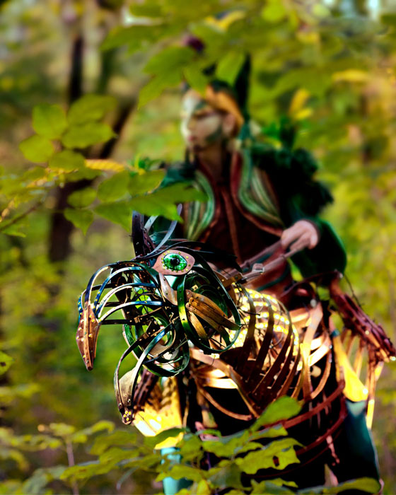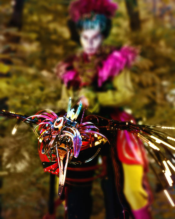Mystical fantasy bird characters with brightly coloured plumage, illuminated bodies and piercing eyes