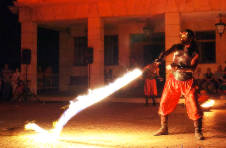 This medieval fire show features a huge range of dramatic, heart pounding attractions to choose from. Roaming performers will mingle among the crowd and enthral guests will fire spinning while colossal stilt walkers stride through the onlookers, breathing fire as they walk. Hire belly dancing fire acts to perform nail-biting balancing acts with trays of fire, or choose a huge pyrotechnic display to close your parade or festival with a bang.