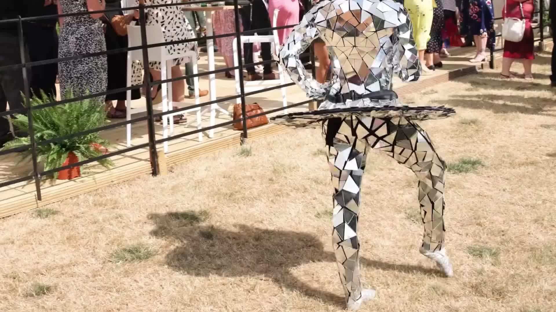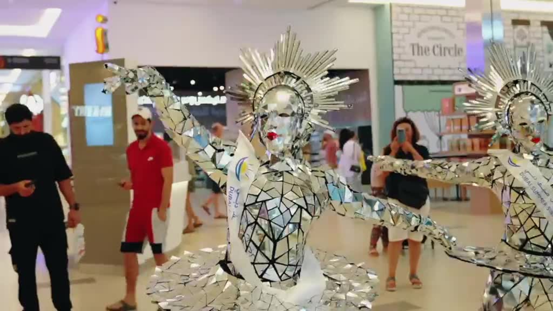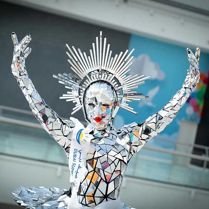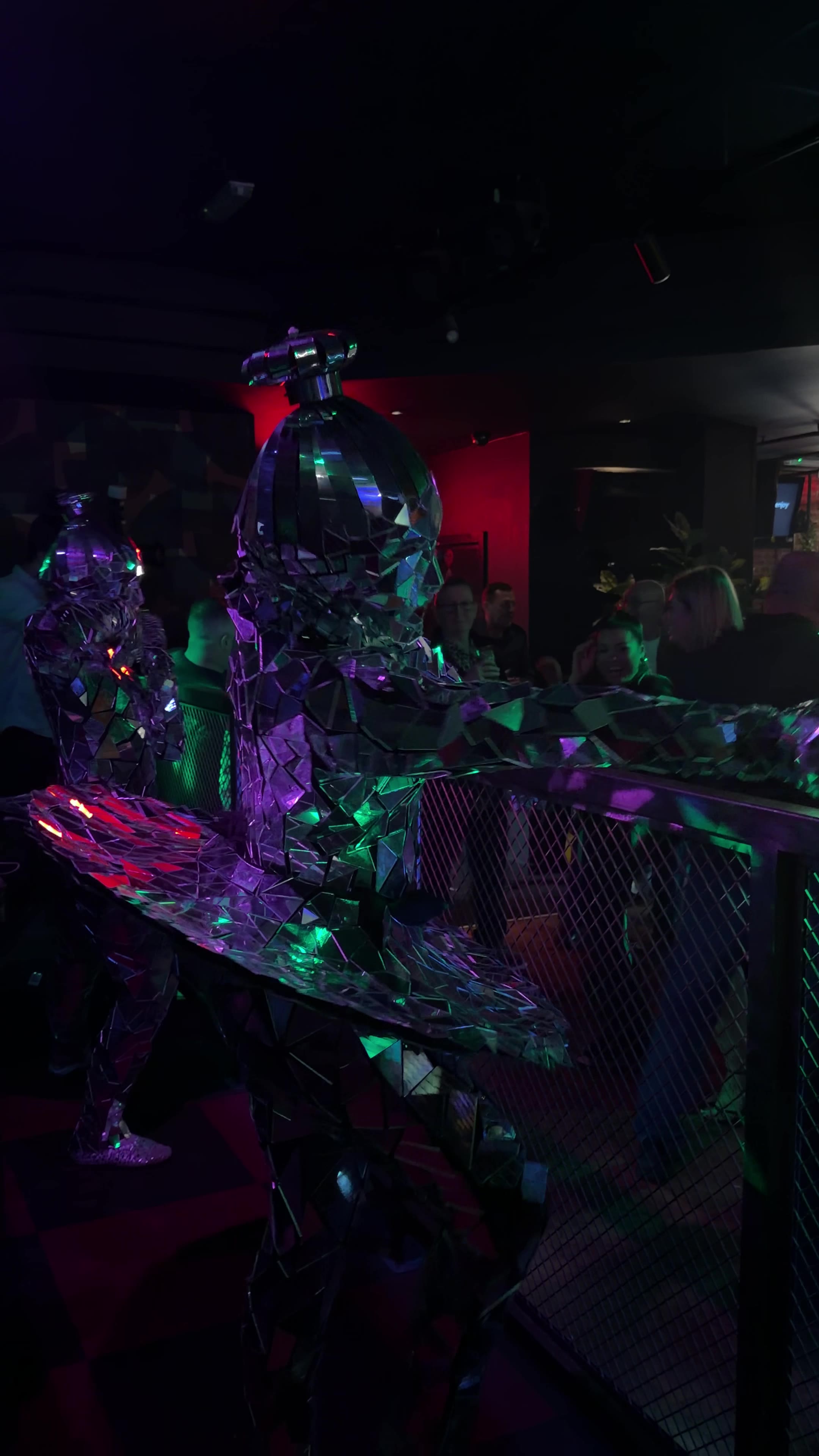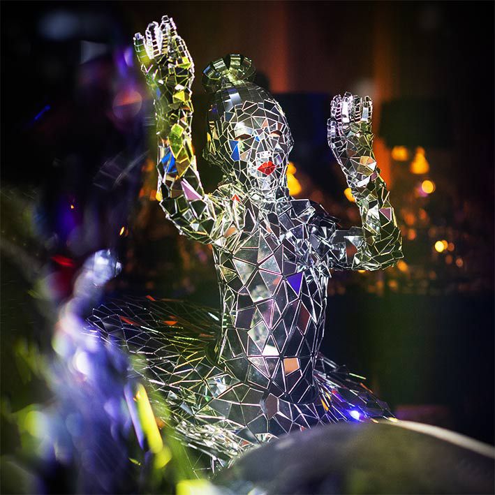 Dressed head to toe in a mosaic pattern of mirrors, these graceful performers reflect the light and ambience of the room around them