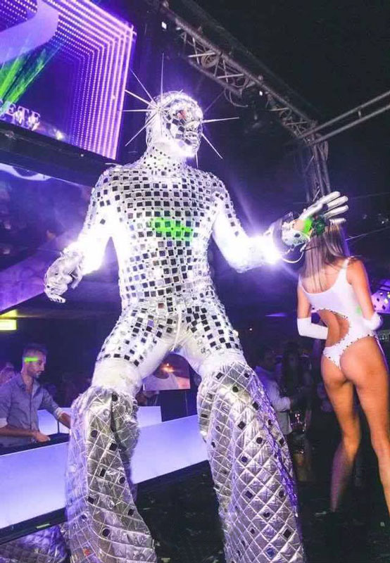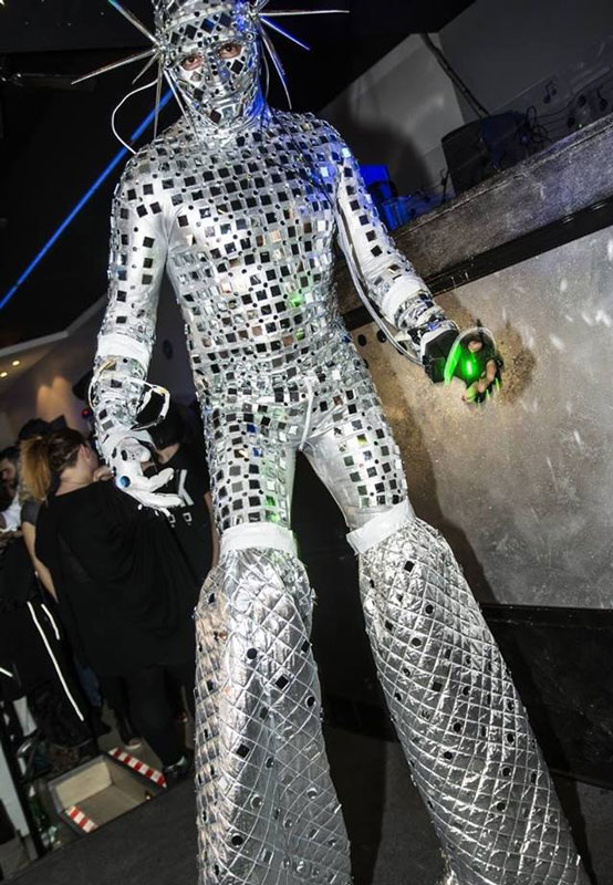 Very popular for night events, our walkabout mirror character can perform both indoors and outdoors. Especially suitable for venues with dim light conditions, our mirror man on stilts adds a unique visual element to any occasion and a bit of quirk fun to your party!